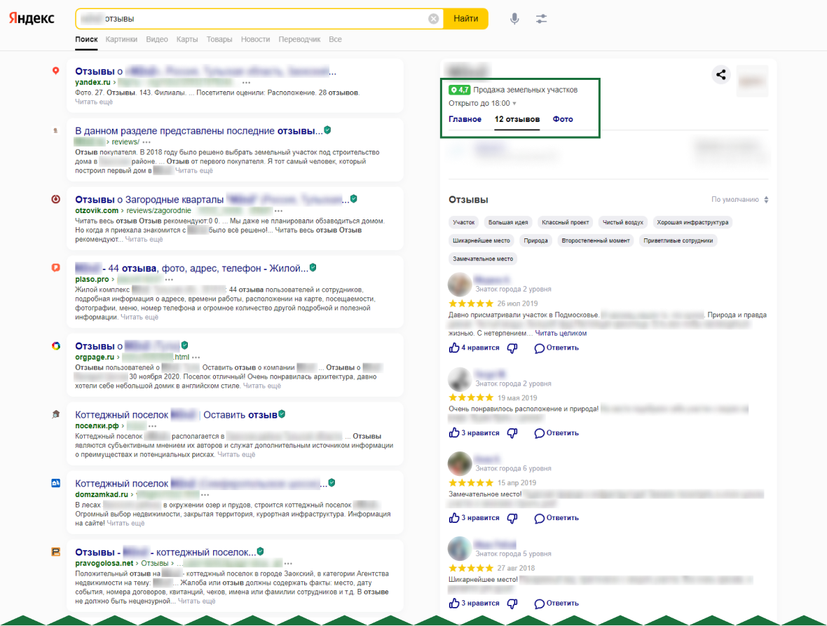 Соответственно нам необходимо было сформировать репутацию с нуля. Для этого мы прошлись по популярным отзовикам – порядка 60 площадок – и разместили информацию о данном посёлке. А после регистрации начали стимулировать пользователей и покупателей оставлять положительные отзывы равномерно по зарегистрированным ранее площадкам. Результат от работы был заметен уже на второй месяц работы, а к моменту 4-го месяца репутация уже была сформирована.